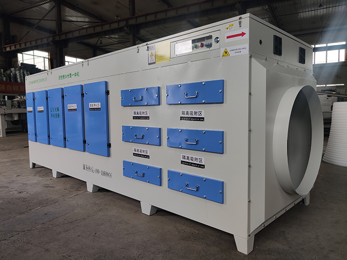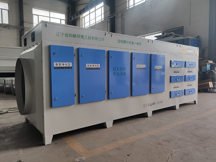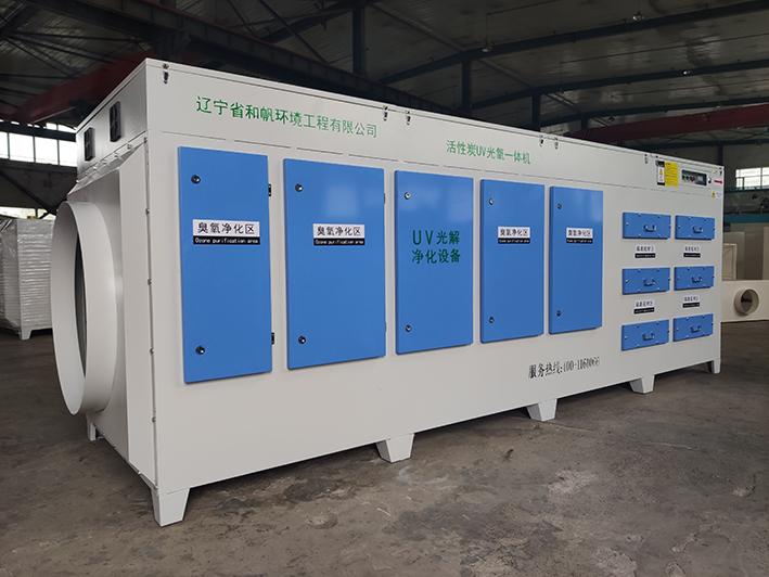 當惡臭氣體利用排風設備輸入到本凈化設備后,凈化設備運用高能C波光束及臭氧對惡臭氣體進行協同分解氧化反應,使惡臭氣體物質其降解轉化成低分子化合物、水和二氧化碳,再通過排風管道排出室外。